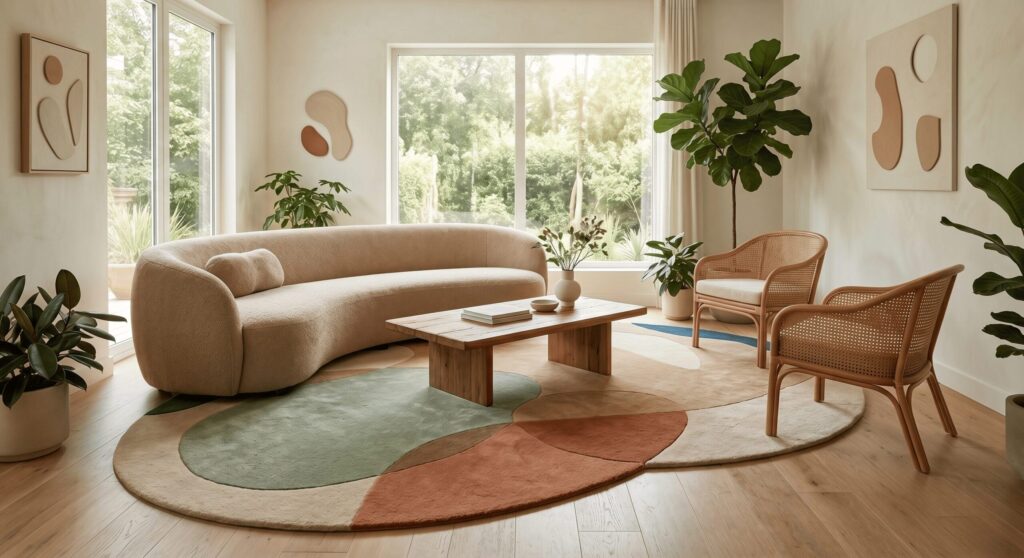 Geleneksel dikdörtgen halılar yerini daha organik ve akışkan formlara bırakıyor. 2026 halı trendleri içinde asimetrik kesimler ve oval hatlar ön planda.