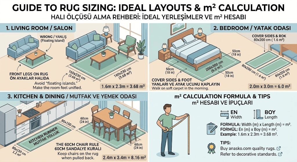Önemli Kural: Halı, masadan en az 60 cm dışarı taşmalıdır. Bu sayede sandalyeler çekildiğinde halının içinde kalır. Sonuç olarak daha güvenli ve şık bir kullanım alanı oluşur.